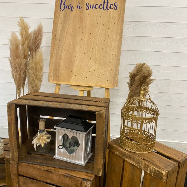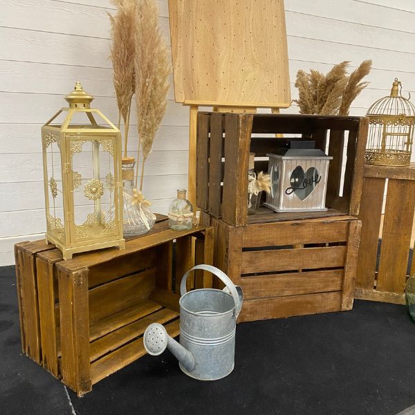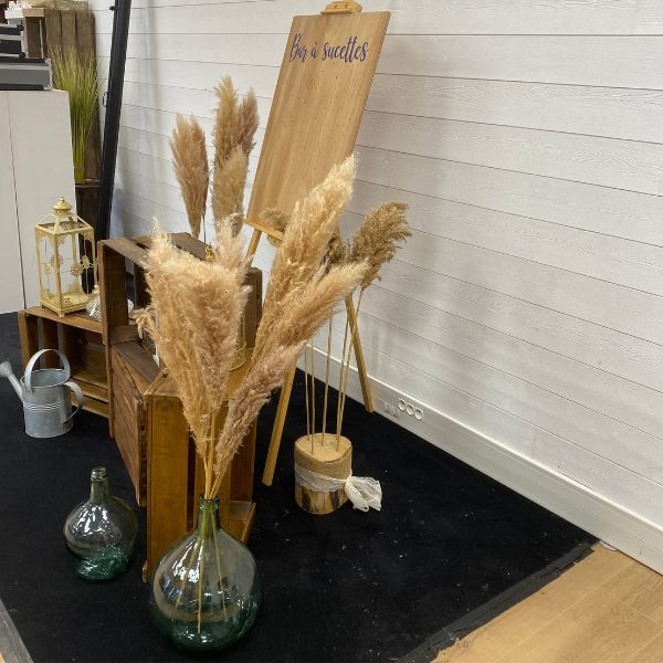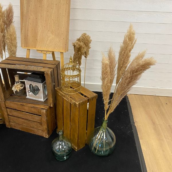 - 4 caisses à pommes, 2 dames Jeannes bleues (10L et 5L) avec 1 bouquet de pampas (6 tiges), 1 bûche de pampas (5) et 1 bûche de roseaux (5), 1 arrosoir, 1 cage à oiseaux dorés, 1 lanterne doré, 1 urne « LOVE », 3 bouteilles décoratives champêtre, un chevalet